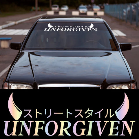 Transform your ride's aesthetic with this bold UNFORGIVEN windshield sticker, featuring iconic JDM and American muscle car imagery. Perfect for Fairlady Z, Mustang, and Devil Z enthusiasts, this high-quality decal makes a statement on any vehicle. Weather-resistant design ensures long-lasting vibrancy through sun, rain, and highway miles. Whether you're repping the tuner scene or classic muscle culture, this sticker captures the raw energy of automotive passion. Easy application, maximum impact.